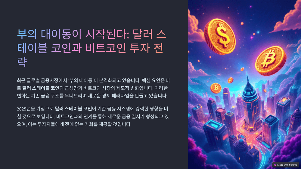 최근 글로벌 금융시장에서 '부의 대이동'이 본격화되고 있습니다. 핵심 요인은 바로 달러 스테이블 코인의 급성장과 비트코인 시장의 제도적 변화입니다. 이러한 변화는 기존 금융 구조를 무너뜨리며 새로운 경제 패러다임을 만들고 있습니다.