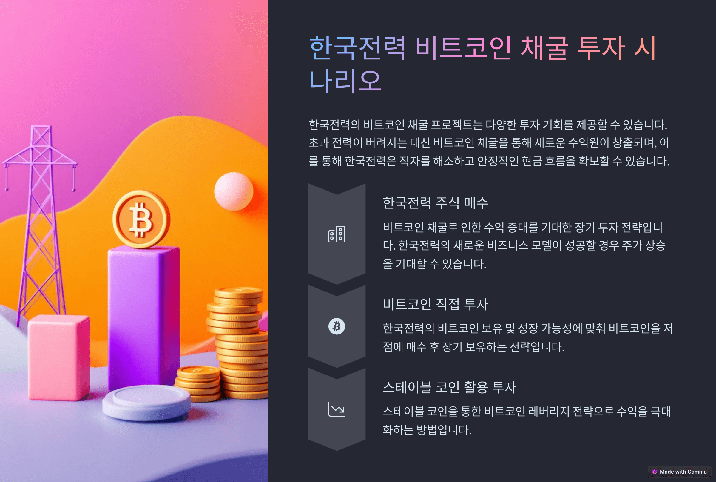 - 비트코인 직접 투자: 한국전력의 비트코인 보유 및 성장 가능성에 맞춰 비트코인을 저점에 매수 후 장기 보유