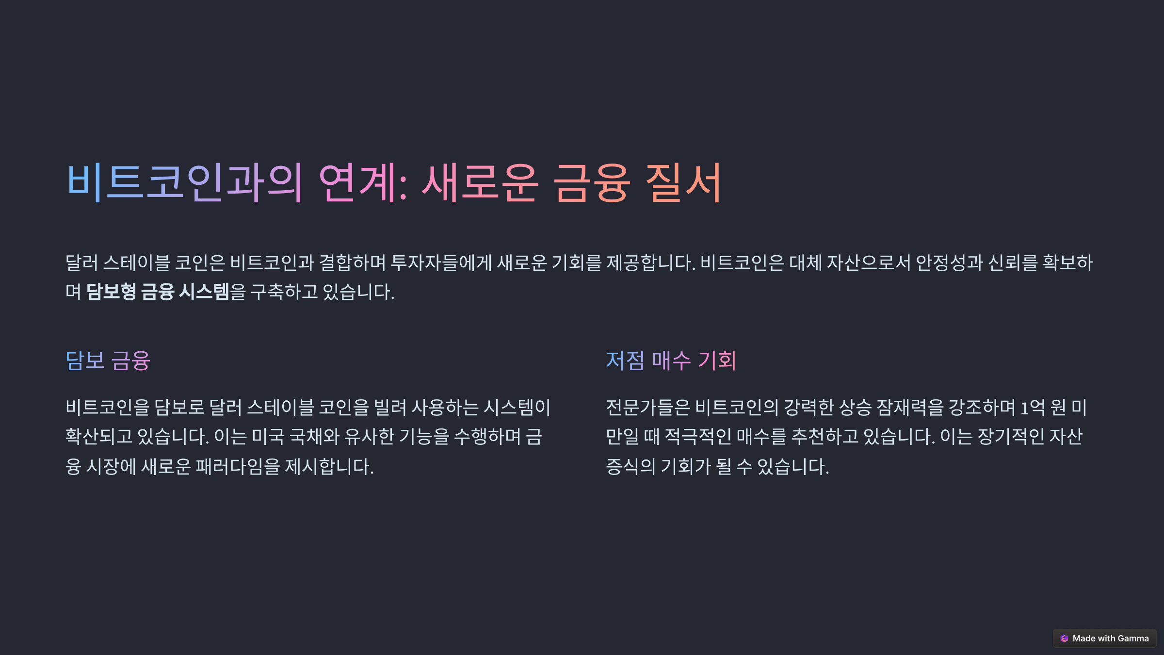 달러 스테이블 코인은 비트코인과 결합하며 투자자들에게 새로운 기회를 제공합니다. 비트코인은 대체 자산으로서 안정성과 신뢰를 확보하며 담보형 금융 시스템을 구축하고 있습니다.