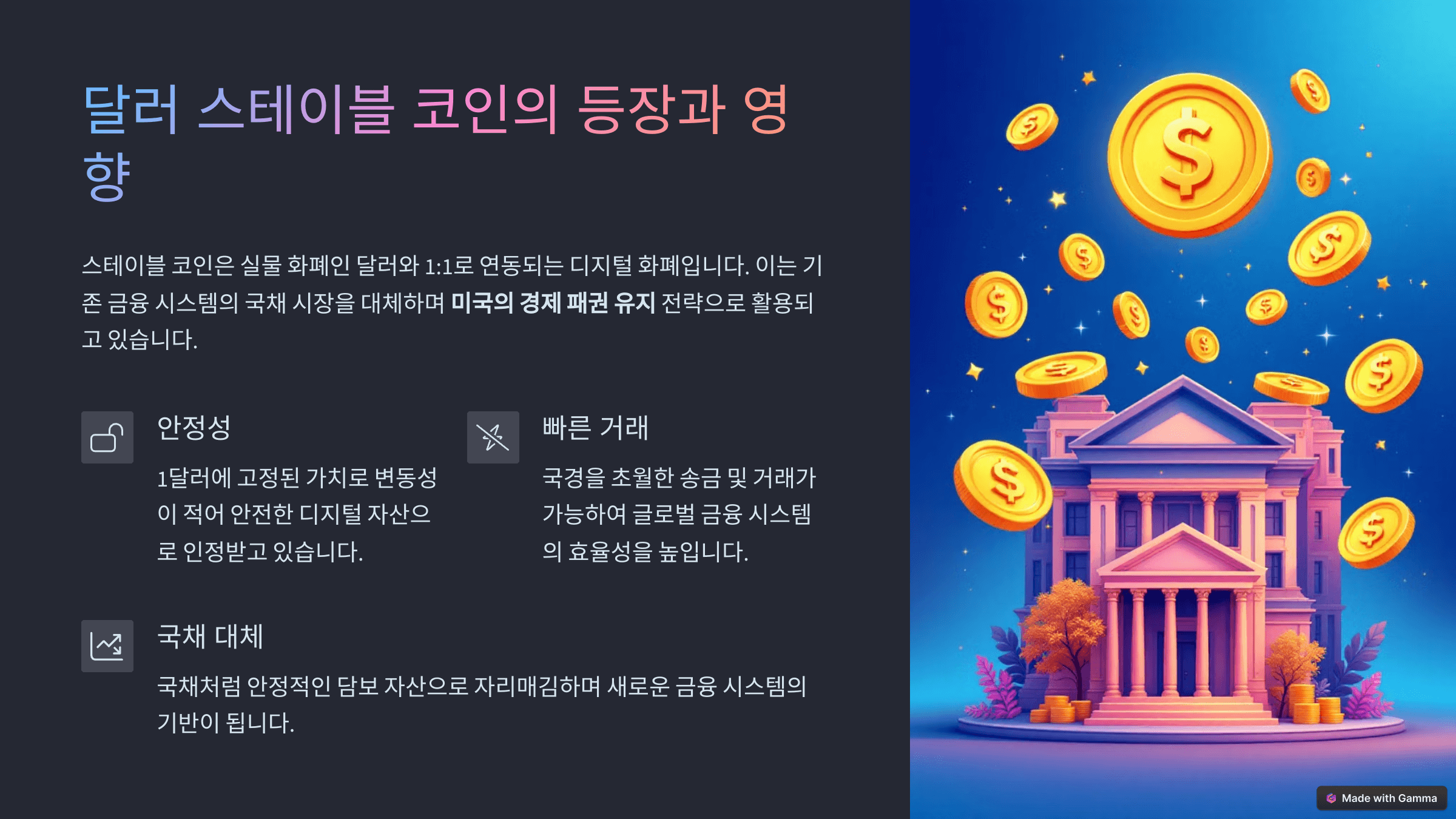 2025년을 기점으로 달러 스테이블 코인이 기존 금융 시스템에 강력한 영향을 미칠 것으로 보입니다. 스테이블 코인은 실물 화폐인 달러와 1:1로 연동되는 디지털 화폐입니다. 이는 기존 금융 시스템의 국채 시장을 대체하며 미국의 경제 패권 유지 전략으로 활용되고 있습니다.