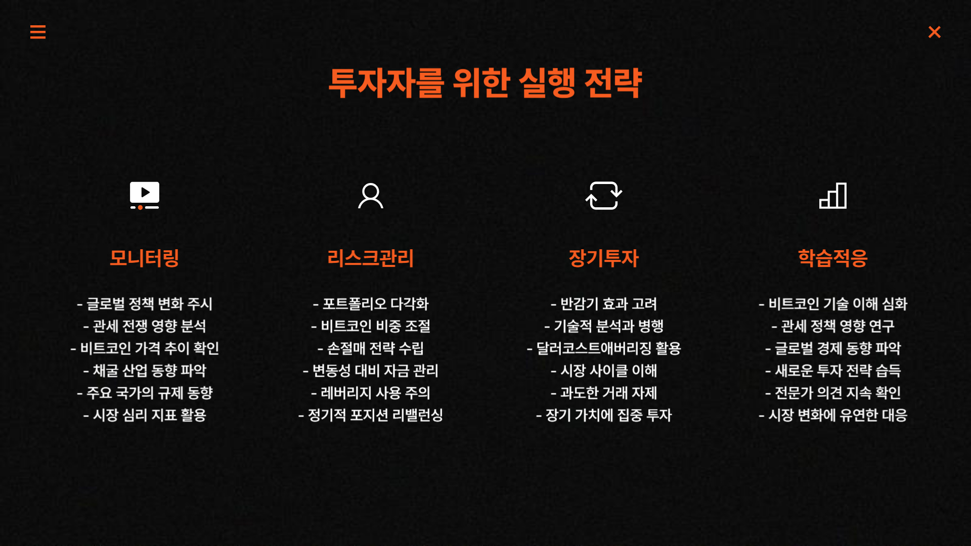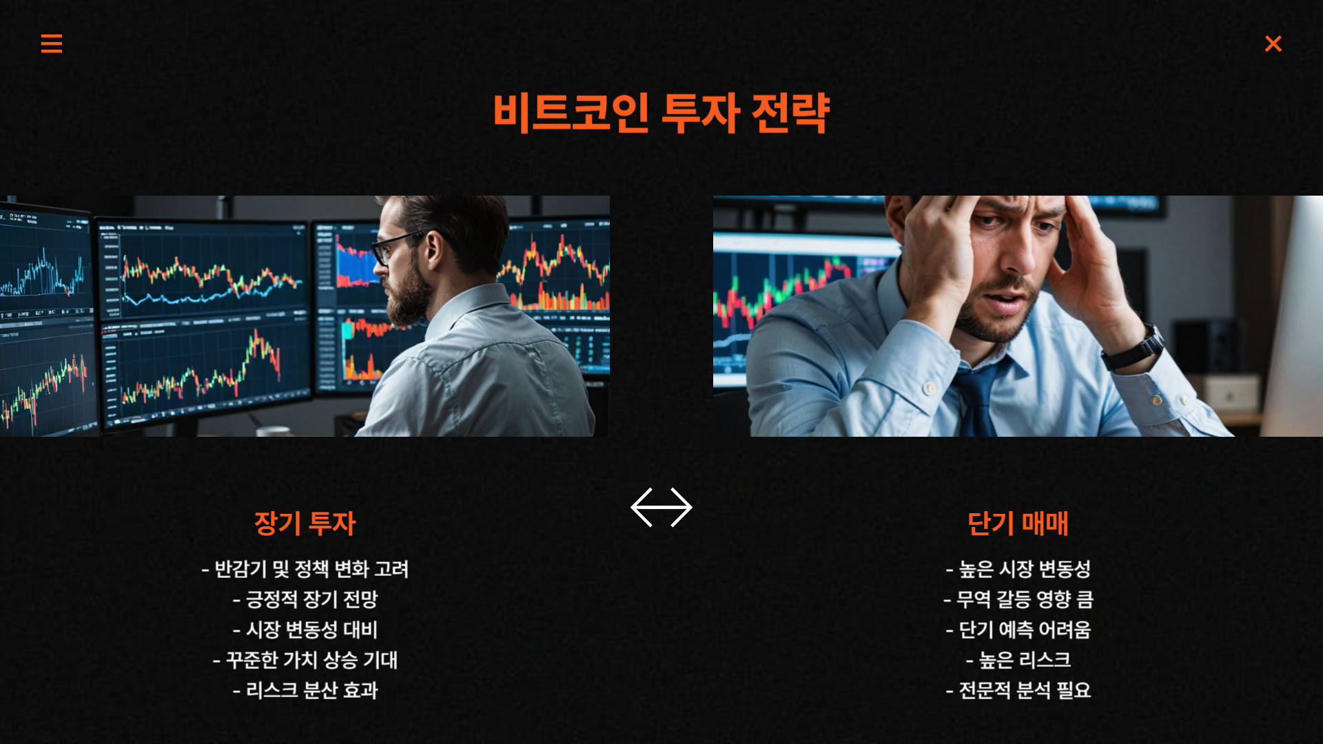 • 비트코인 비중 조절: 자산 포트폴리오에서 비트코인을 일정 비율로 유지하며, 변동성에 대비하는 것이 중요합니다.