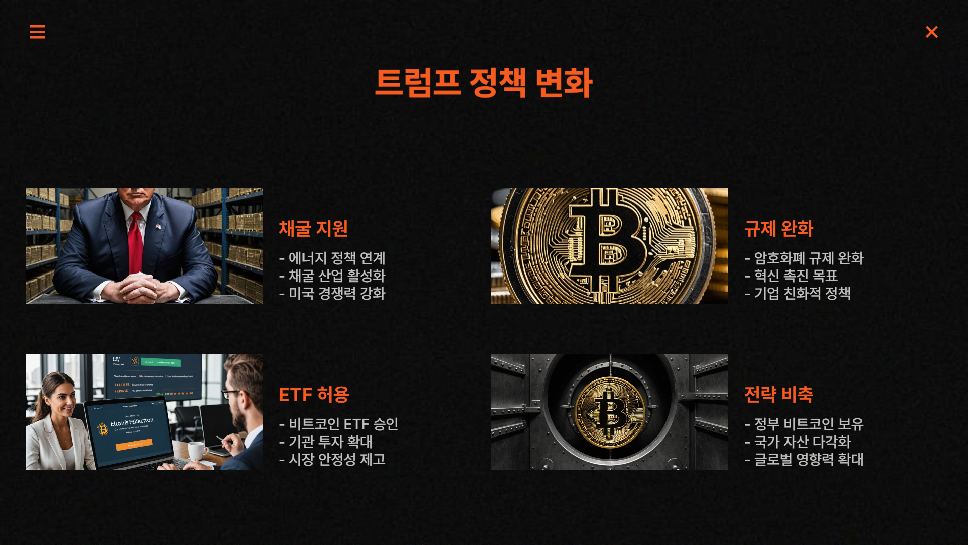 • 비트코인 채굴 산업 활성화: 트럼프 행정부는 에너지 정책과 연계하여 비트코인 채굴을 지원할 계획을 세우고 있습니다.