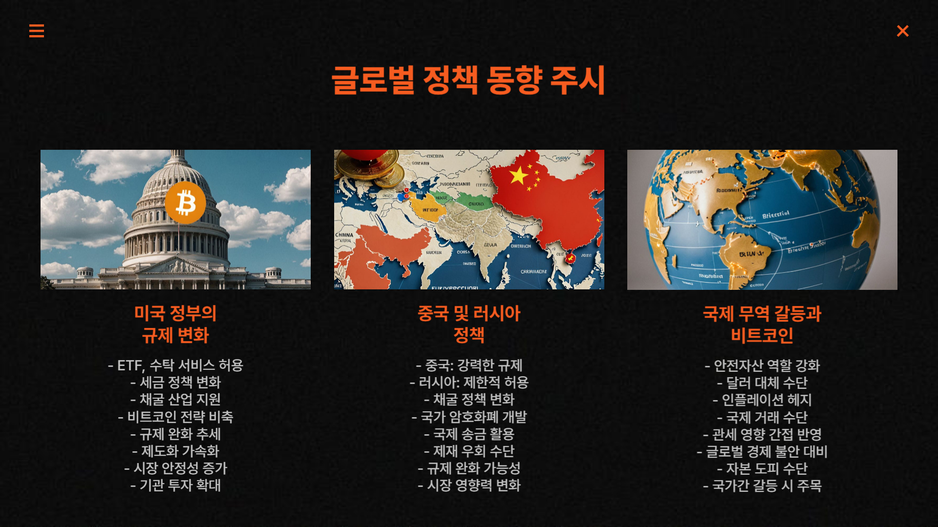 • 미국 정부의 규제 변화: 비트코인 관련 ETF, 수탁 서비스, 세금 정책 등을 면밀히 살펴볼 필요가 있습니다.