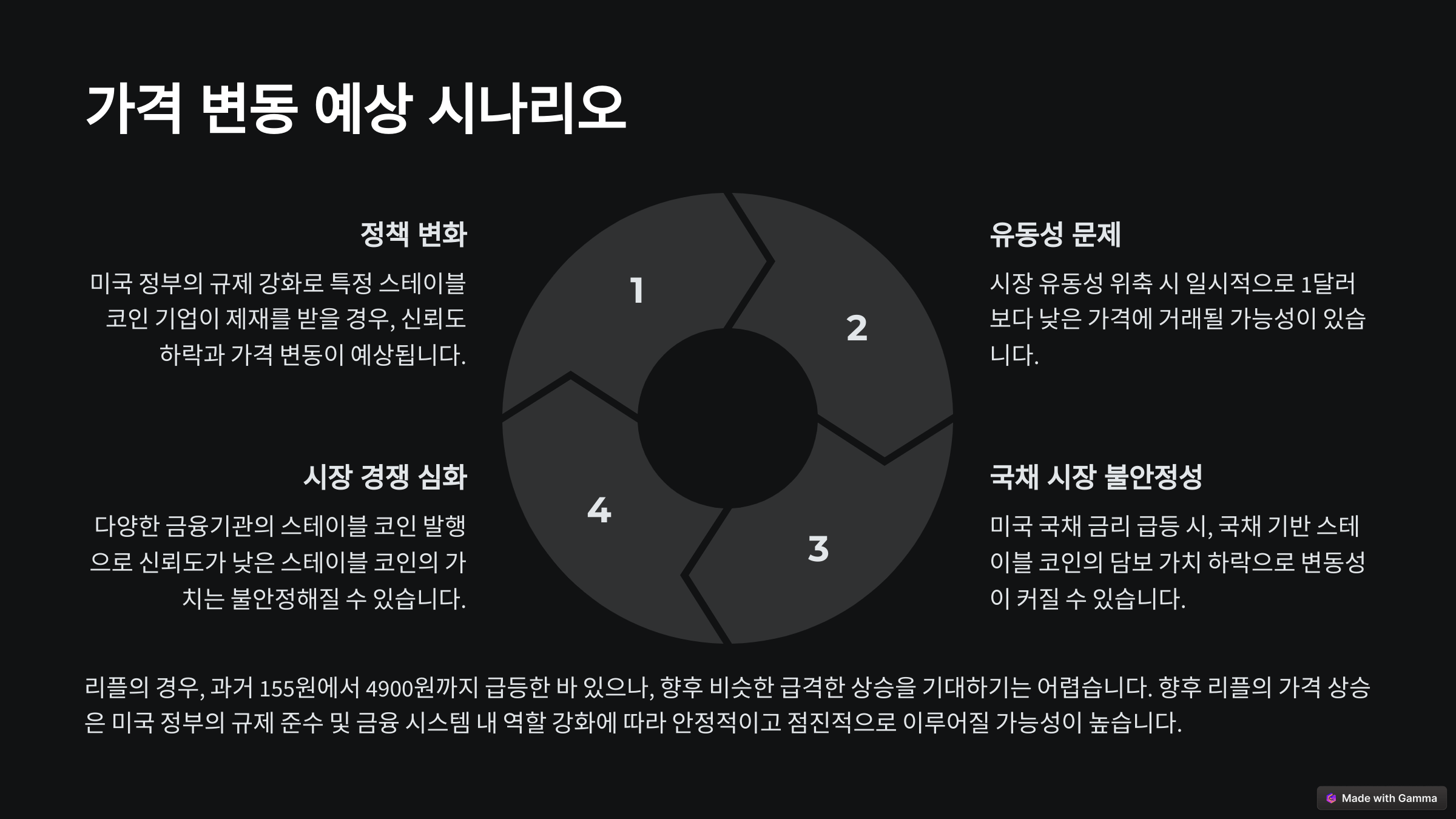- 정책 변화: 미국 정부의 규제 강화로 특정 스테이블 코인 기업이 제재를 받을 경우, 신뢰도 하락과 가격 변동이 예상됩니다.