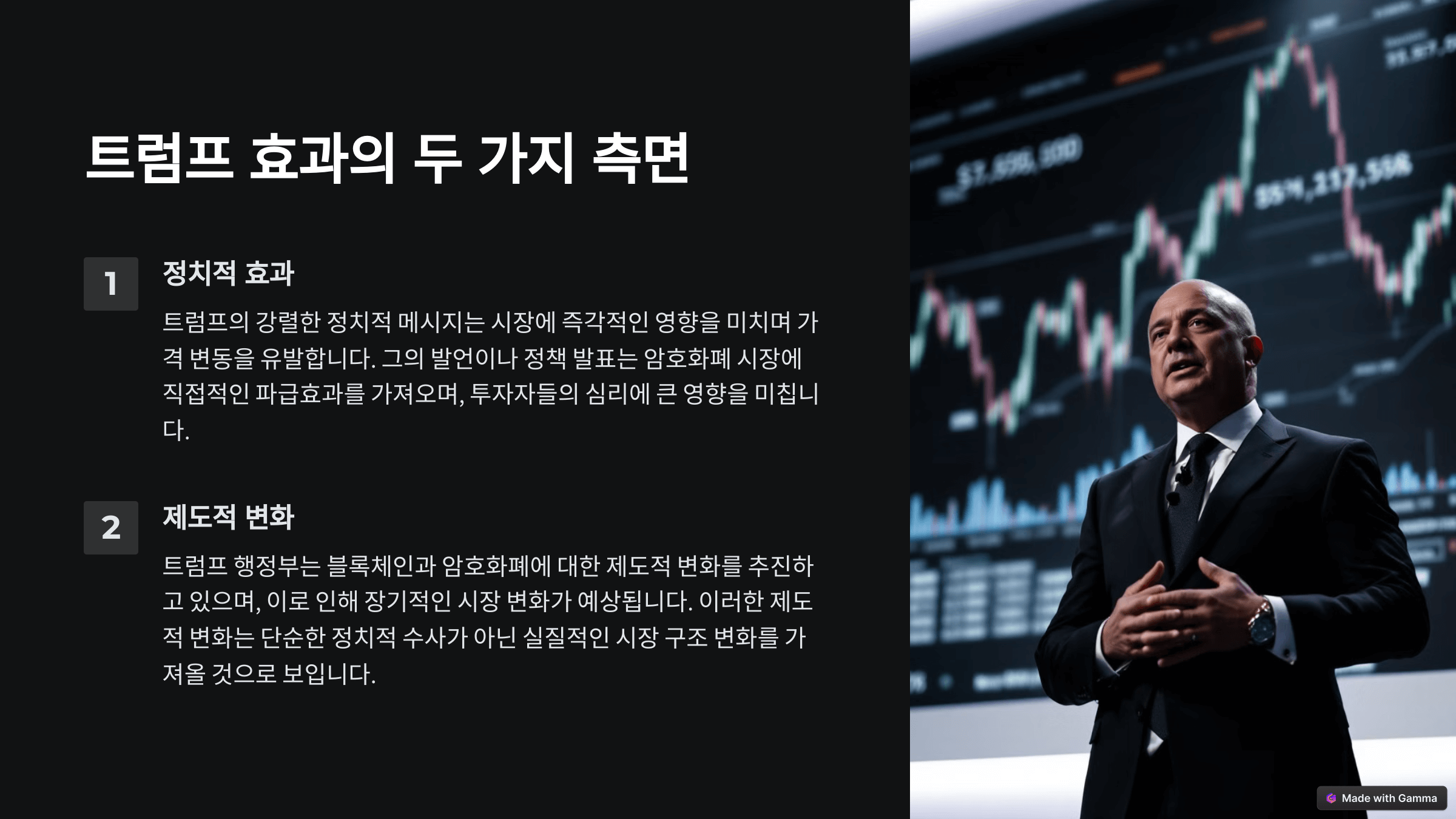 - 정치적 효과: 트럼프의 강렬한 정치적 메시지는 시장에 즉각적인 영향을 미치며 가격 변동을 유발합니다.