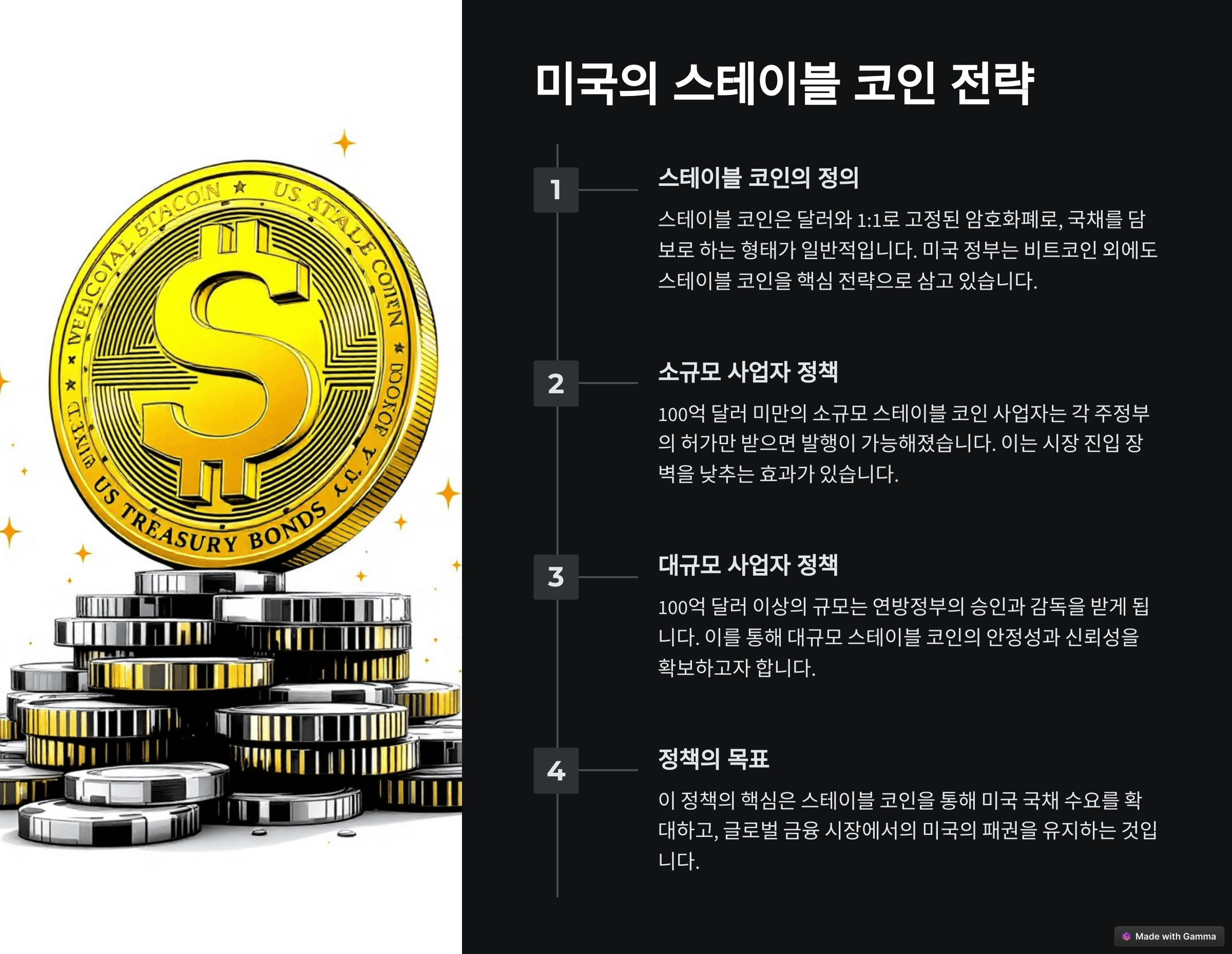 미국 정부는 비트코인 외에도 스테이블 코인을 핵심 전략으로 삼고 있습니다. 스테이블 코인은 달러와 1:1로 고정된 암호화폐로, 국채를 담보로 하는 형태가 일반적입니다.